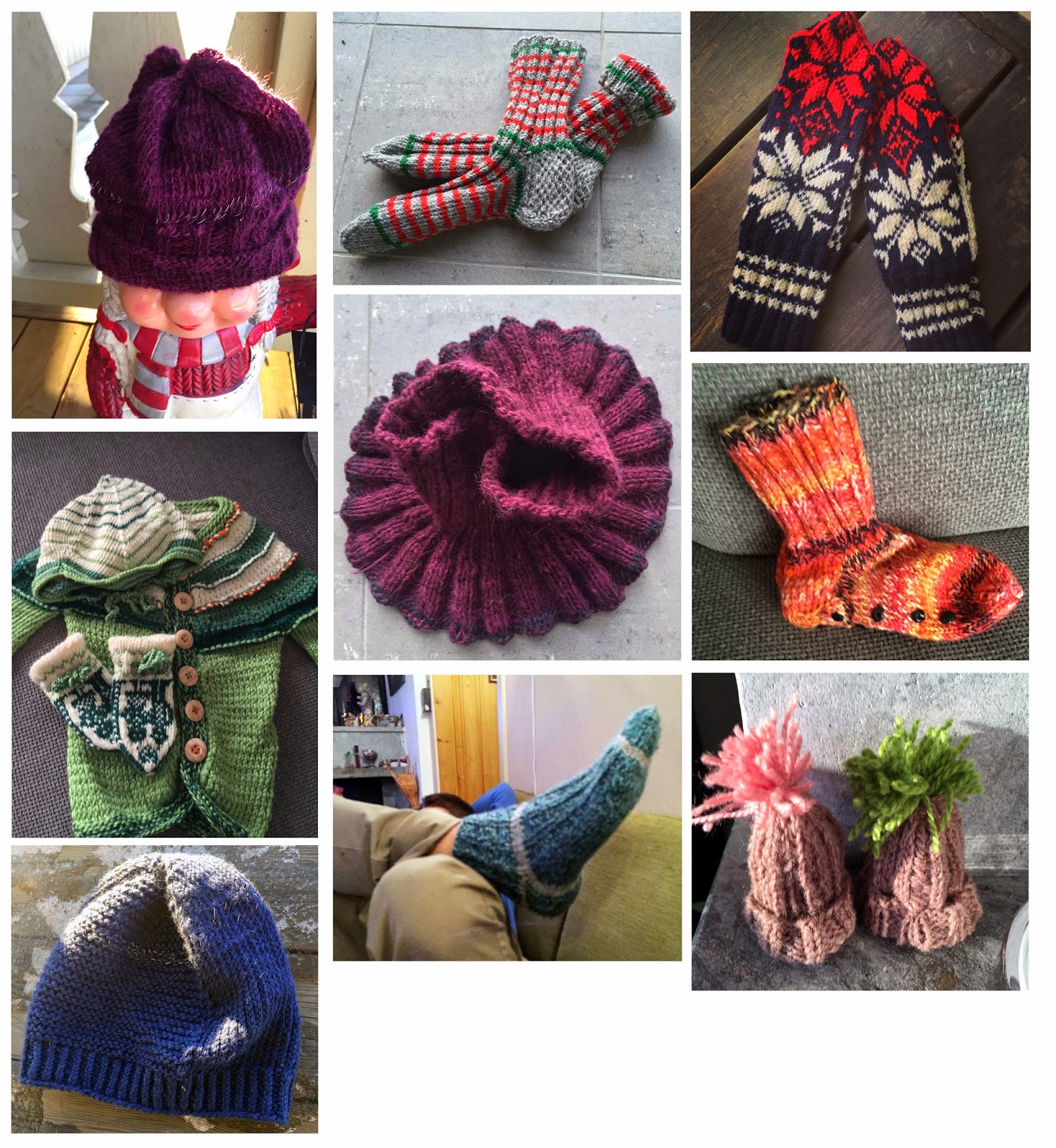 Her er julegavene eg strikka. Nokre er vist fram her, mens andre er ikkje vist fram ennå. Luer, sokker, votter, babyjakke og eggvarmere.